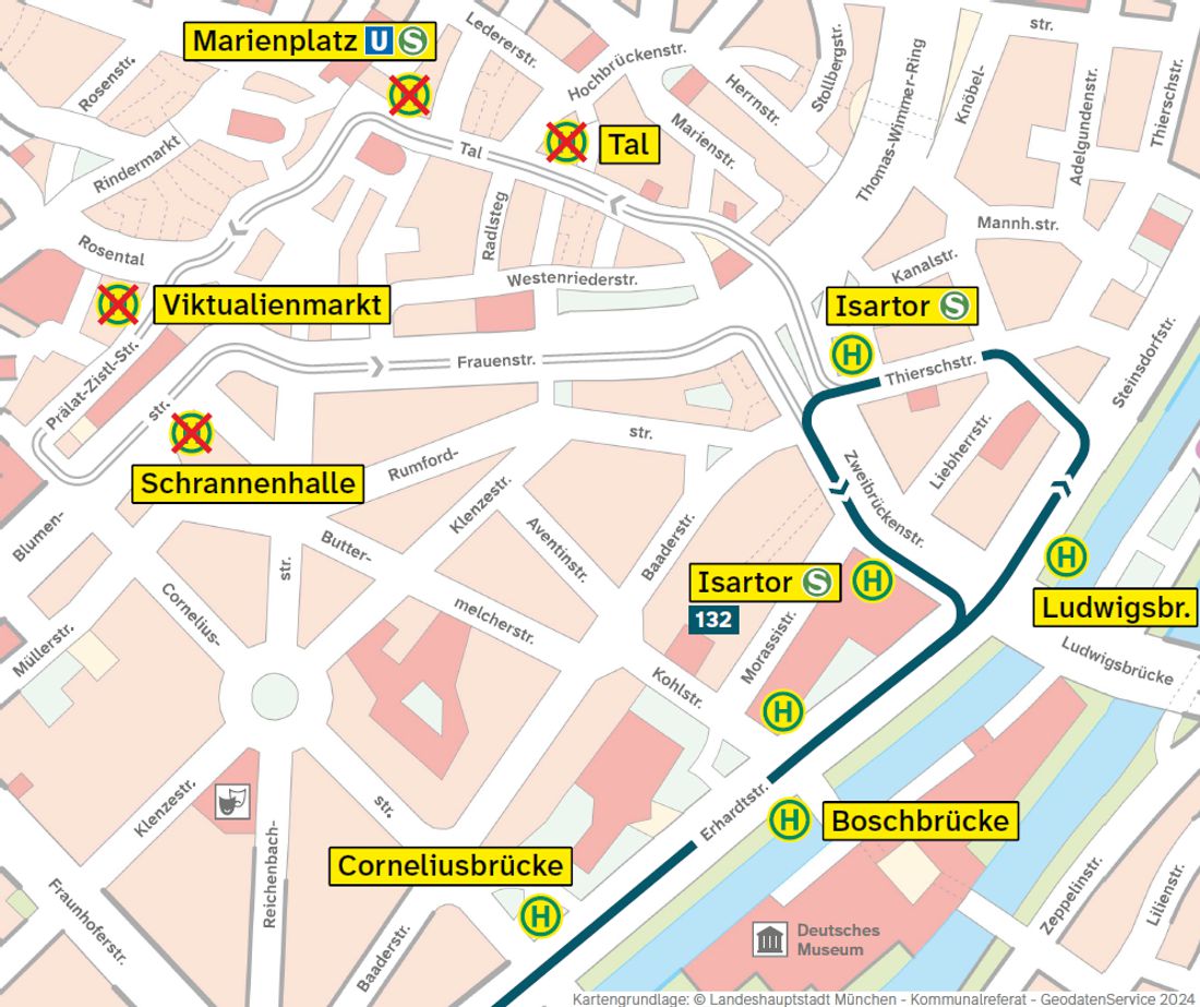 Die Buslinie 132 beginnt bzw. endet am Dienstag, 17. Februar 2026 von Betriebsbeginn bis ca. 21:00 Uhr an der (H) Isartor (Zweibrückenstraße). Zwischen Isartor und Marienplatz können Sie die S-Bahnen nutzen.
