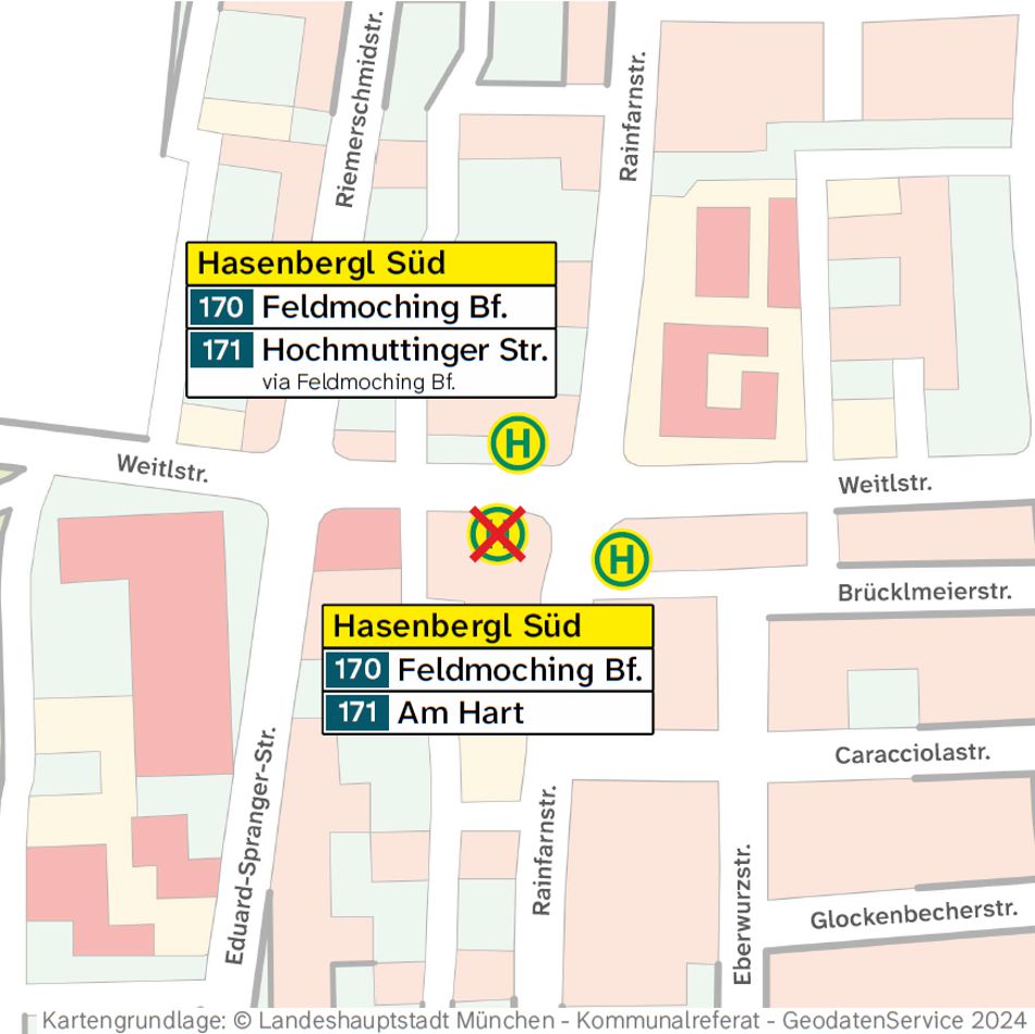 Wegen Fernwärmebauarbeiten in der Weitlstraße ist die (H) Hasenbergl Süd der Buslinien 170 > Kieferngarten und 171 > Am Hart von Montag, 16. März bis vsl. Sonntag, 7. Juni 2026 an die Haltestelle der Buslinie 60 > Dülferstraße südlich der Einmündung Rainfarn- / Weitlstraße verlegt.