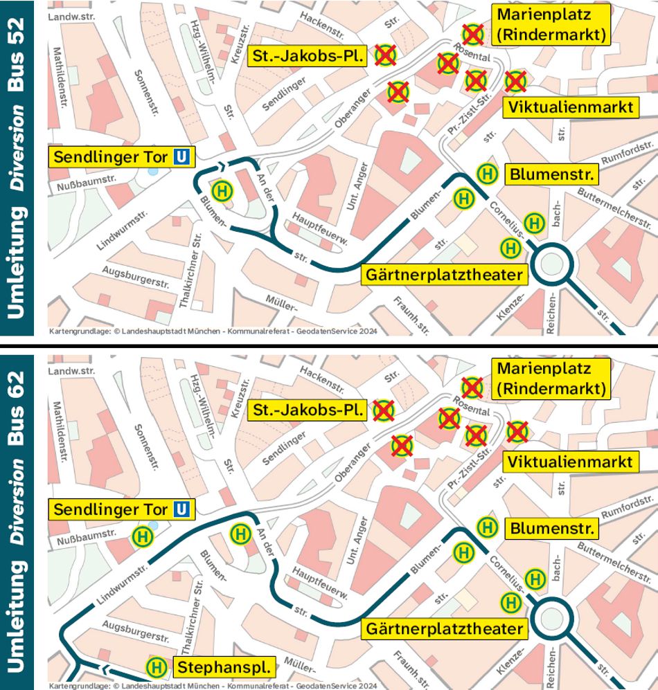 Die (H) St.-Jakobs-Platz, Marienplatz (Rindermarkt) und Viktualienmarkt entfallen in beiden Richtungen.