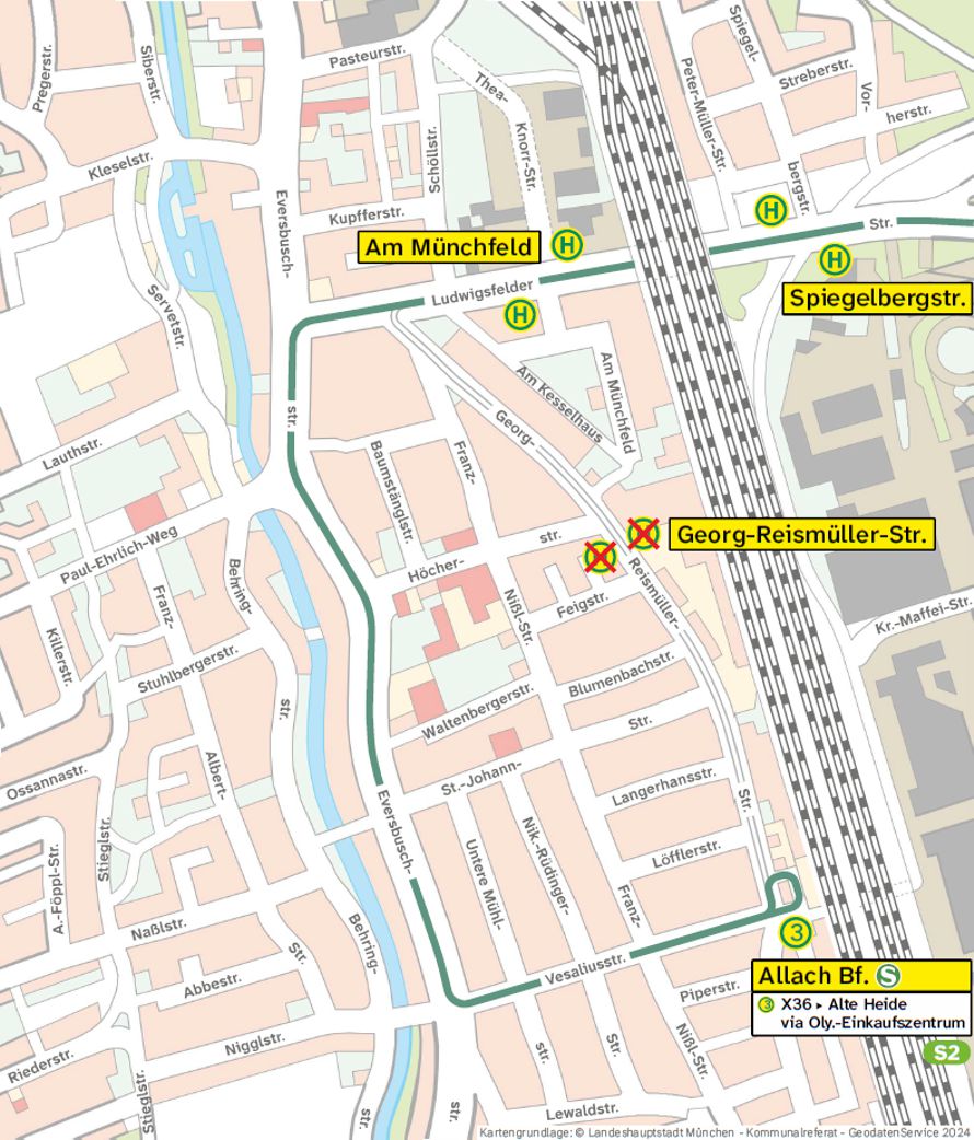 Wegen des Allacher Faschingszugs wird die Buslinie X36 am Dienstag, 17. Februar 2026 von ca. 13:30 bis 16:00 Uhr zwischen Allach Bf. und Am Münchfeld über die Eversbuschstraße umgeleitet. Die (H) Georg-Reismüller-Straße entfällt.